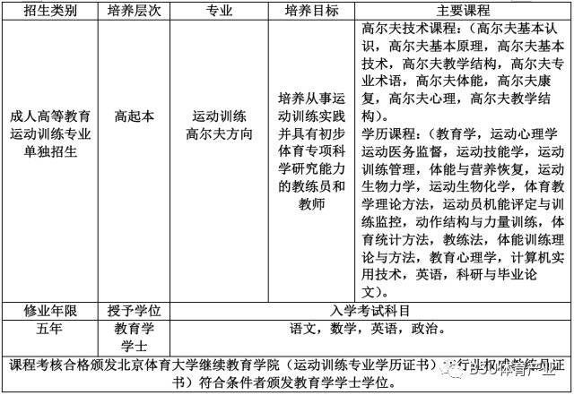 01 招生计划 1.高尔夫学历研修班全国招收300人。 2.高尔夫学历研修班全国招收100人。 02 招生项目 1.高尔夫学历研修班 报名条件及办法 01 条件 1.遵纪守法,品德良好,热爱体育事业。 2.报考专升本科的考生必须是已经取得经教育部审定核准的国民教育系列高等学校,高等教育学自学考试机构颁发的高等专科毕业证书或以上证书的人员。 4.高起本考生必须有高中毕业证书或中专毕业证书。 02 报名办法 1.报名地点:北京体育大学。 报名材料:交验本人身份证原件并留存复印件; 交验学历证书原件并留存复印件; 2.报考专升本科的考生必须提交教育部信息网毕业证书查询结果打印件或教育部学历认证中心 出具的学历认证报告复印件; 3.近期免冠正面1寸照片三张(一张必须贴在《报名表》上)。 4.报名学生需缴纳报名费,可通过银行卡、微信、支付宝转账方式支付,报名后学员需要按照面试时间提前到我校报到参加面试。 考试与录取办法 01 考试 1.考试时间:时间以届时北京体育大学相关文件为准。 2.考试地点:北京体育大学。 3.考试科目:专项基本技术;高起本:(语文 数学 英语 政治) 专升本:(运动生理学 运动心理学 运动训练学 综合考试)。 02 录取办法 文化考试最低录取分数线由北京体育大学拟定,国家体育总局核准,对达到分数线的考生,按照计划从高分到低分择优录取。 03 报名咨询联系方式 高尔夫学历研修班 负责老师:18811766766 杜老师。